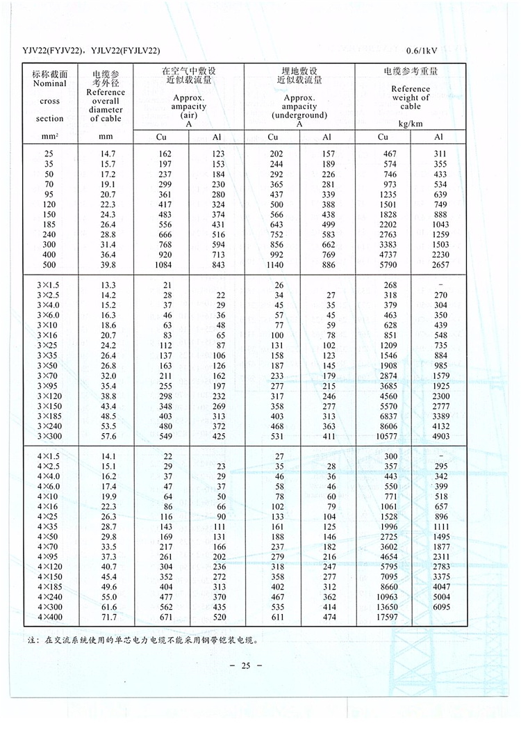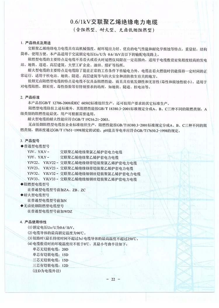 詳細(xì)介紹:YJV22敷設(shè)在地下,能承受機(jī)械外力作用,但不能承受烯絕緣鋼帶鎧裝聚氯乙烯護(hù)套電力電纜 較大拉力。